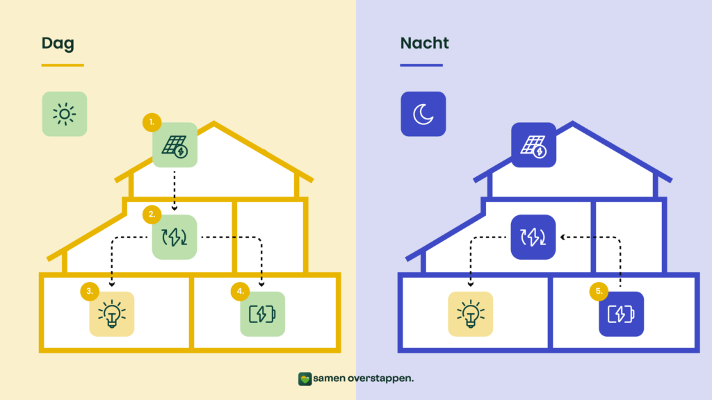 - Is er stroom over? Dan wordt deze naar je thuisbatterij gestuurd. Die slaat de energie op voor een later moment.